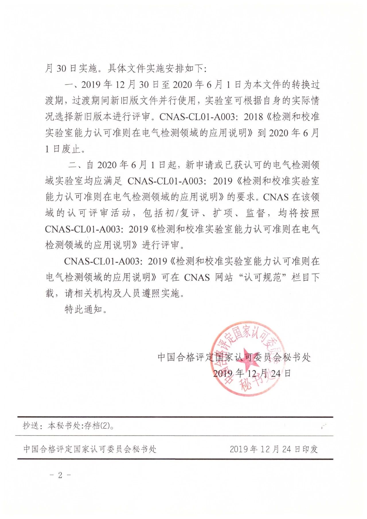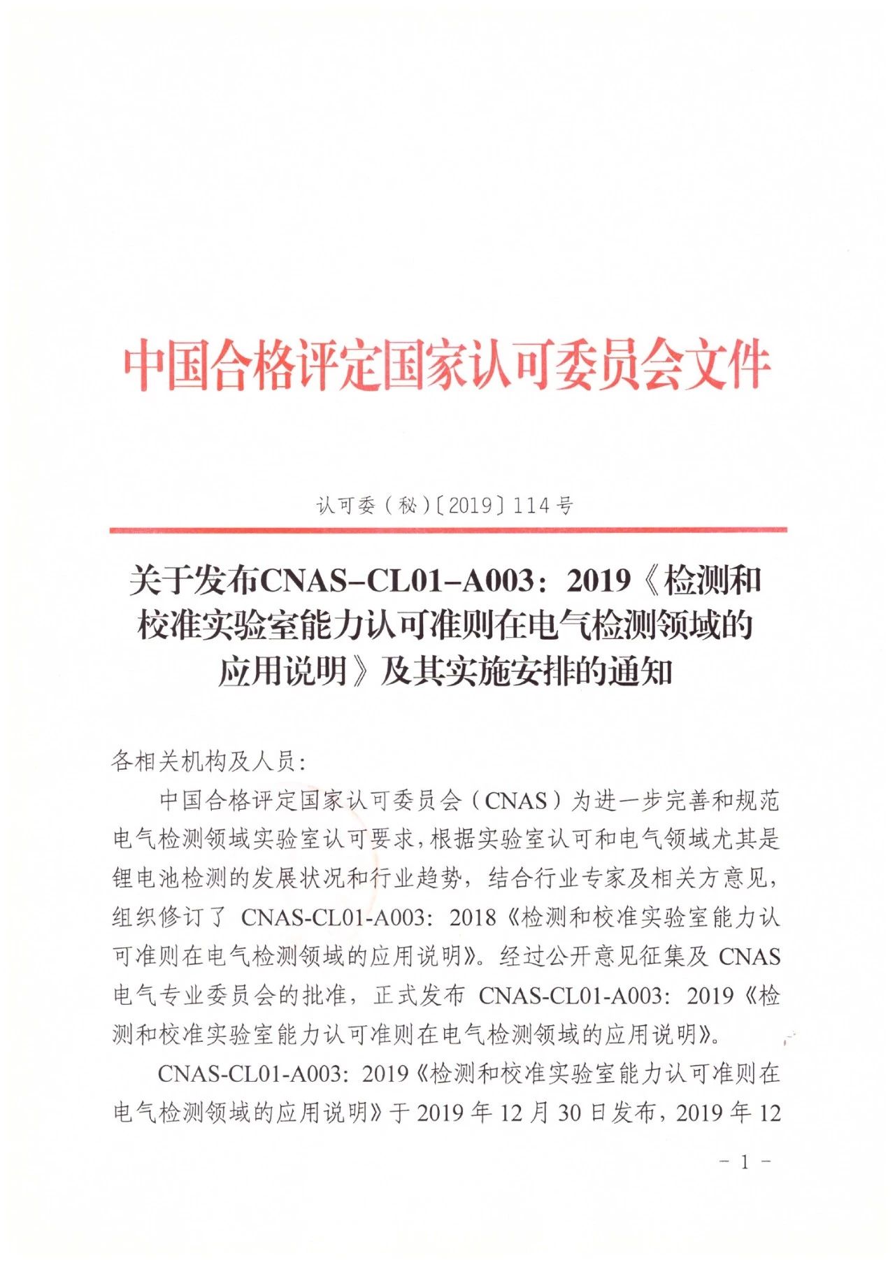 關(guān)于發(fā)布CNAS-CL01-A003:2019《檢測和校準(zhǔn)實(shí)驗(yàn)室能力認(rèn)可準(zhǔn)則在電氣檢測領(lǐng)域的應(yīng)用說明》及其實(shí)施安排的通知