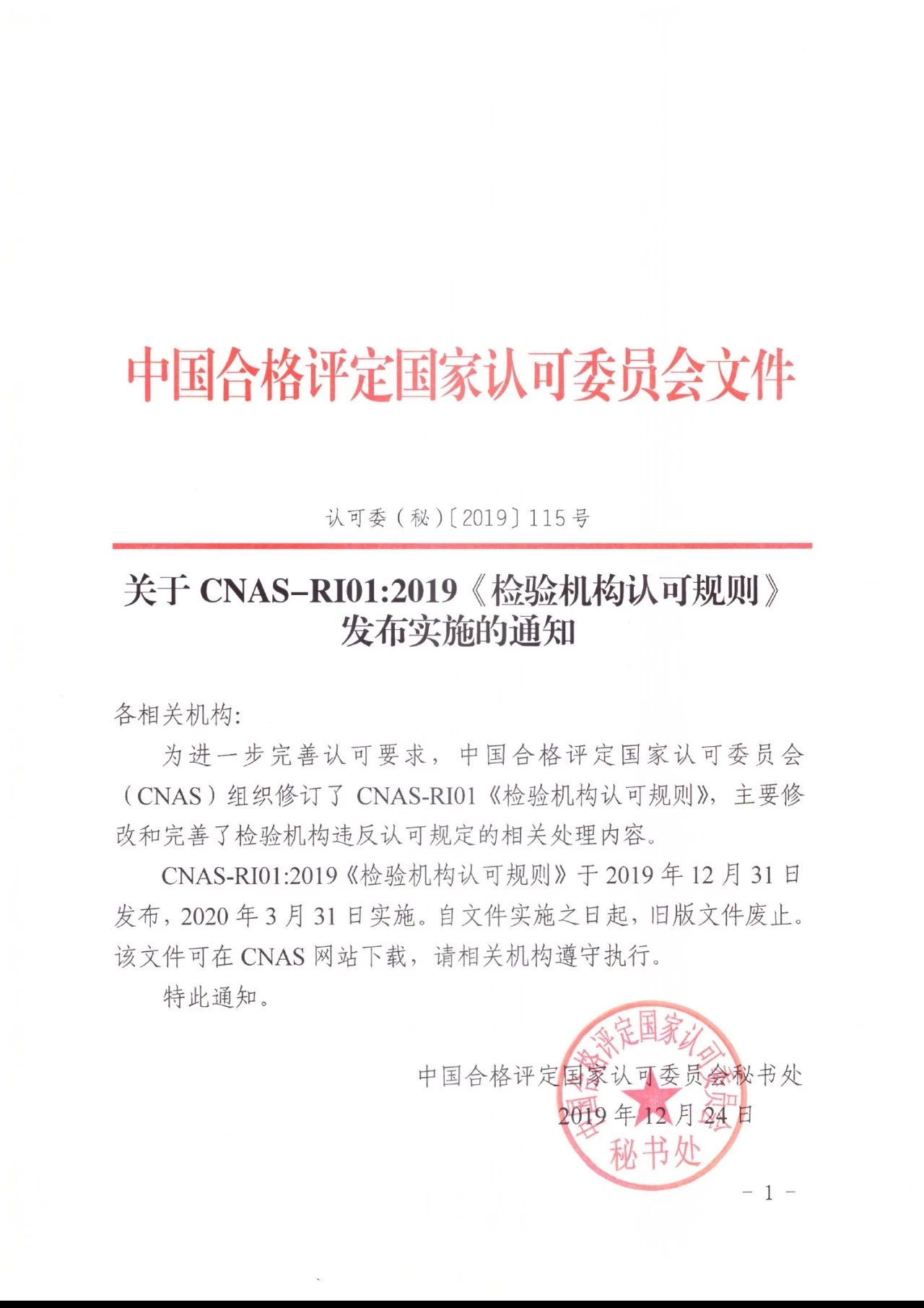 關(guān)于CNAS-RI01:2019《檢驗(yàn)機(jī)構(gòu)認(rèn)可規(guī)則》發(fā)布實(shí)施的通知