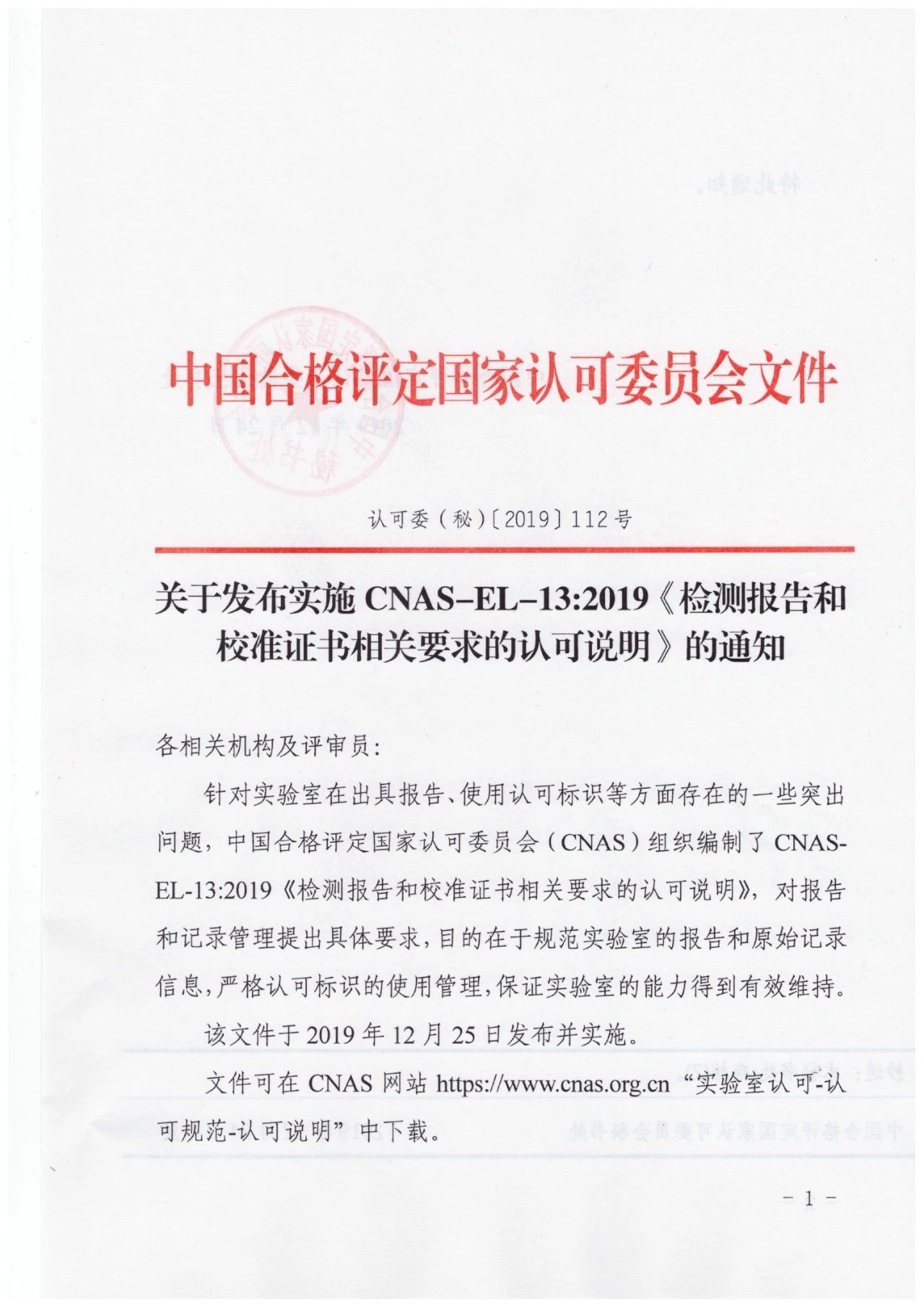 關(guān)于發(fā)布實(shí)施CNAS-EL-13:2019《檢測報(bào)告和校準(zhǔn)證書相關(guān)要求的認(rèn)可說明》的通知