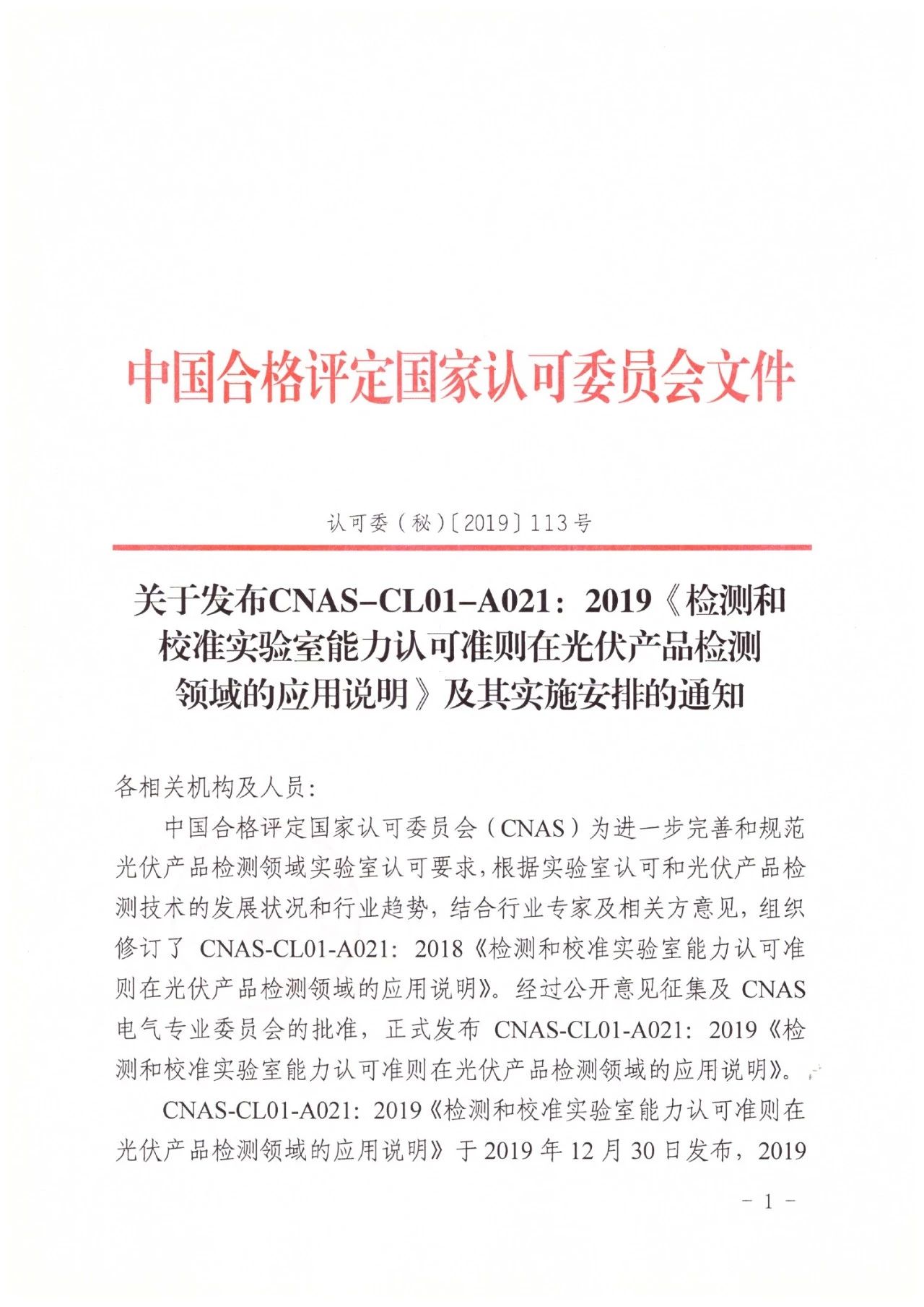 關(guān)于發(fā)布CNAS-CL01-A021:2019《檢測和校準(zhǔn)實(shí)驗(yàn)室能力認(rèn)可準(zhǔn)則在光伏產(chǎn)品檢測領(lǐng)域的應(yīng)用說明》及其實(shí)施安排的通知